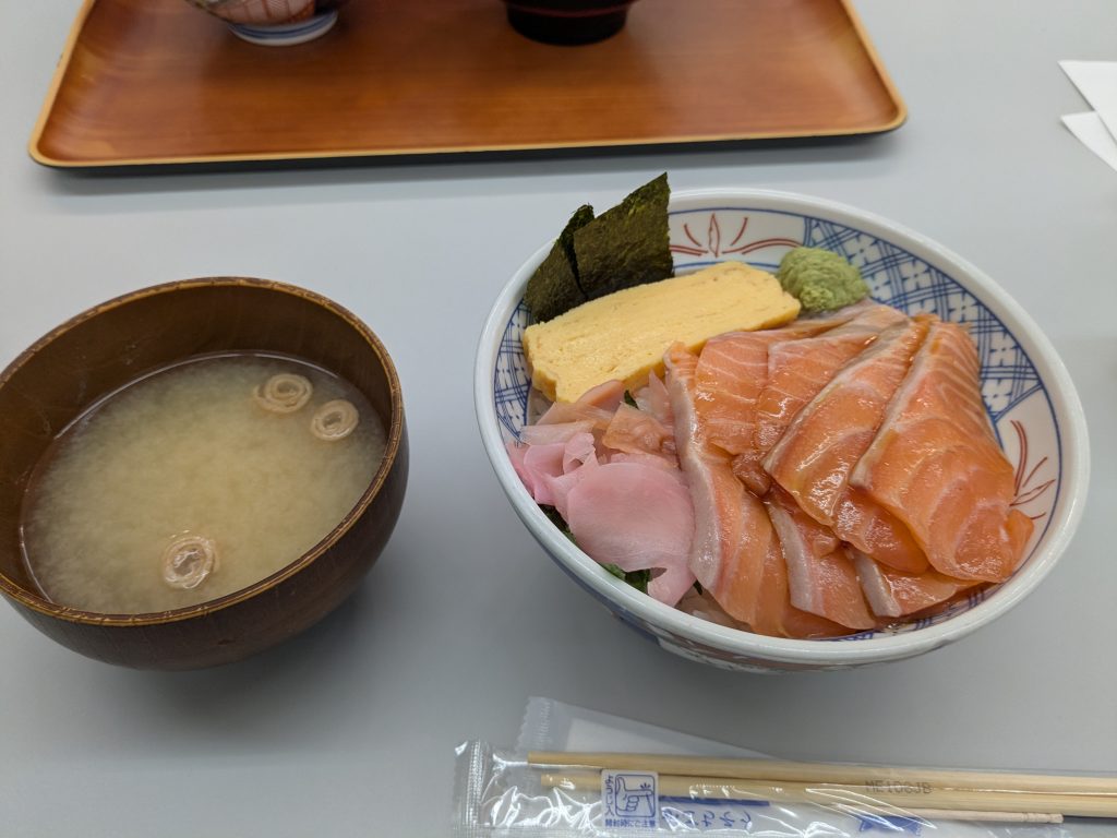 これ、2週同じ店に行ってるんよな。上のサーモン丼はちょっと贅沢、1500円。下の切れ端丼的なのは900円。この時代にお味噌汁付きの海鮮丼が1000円切るのはええね。